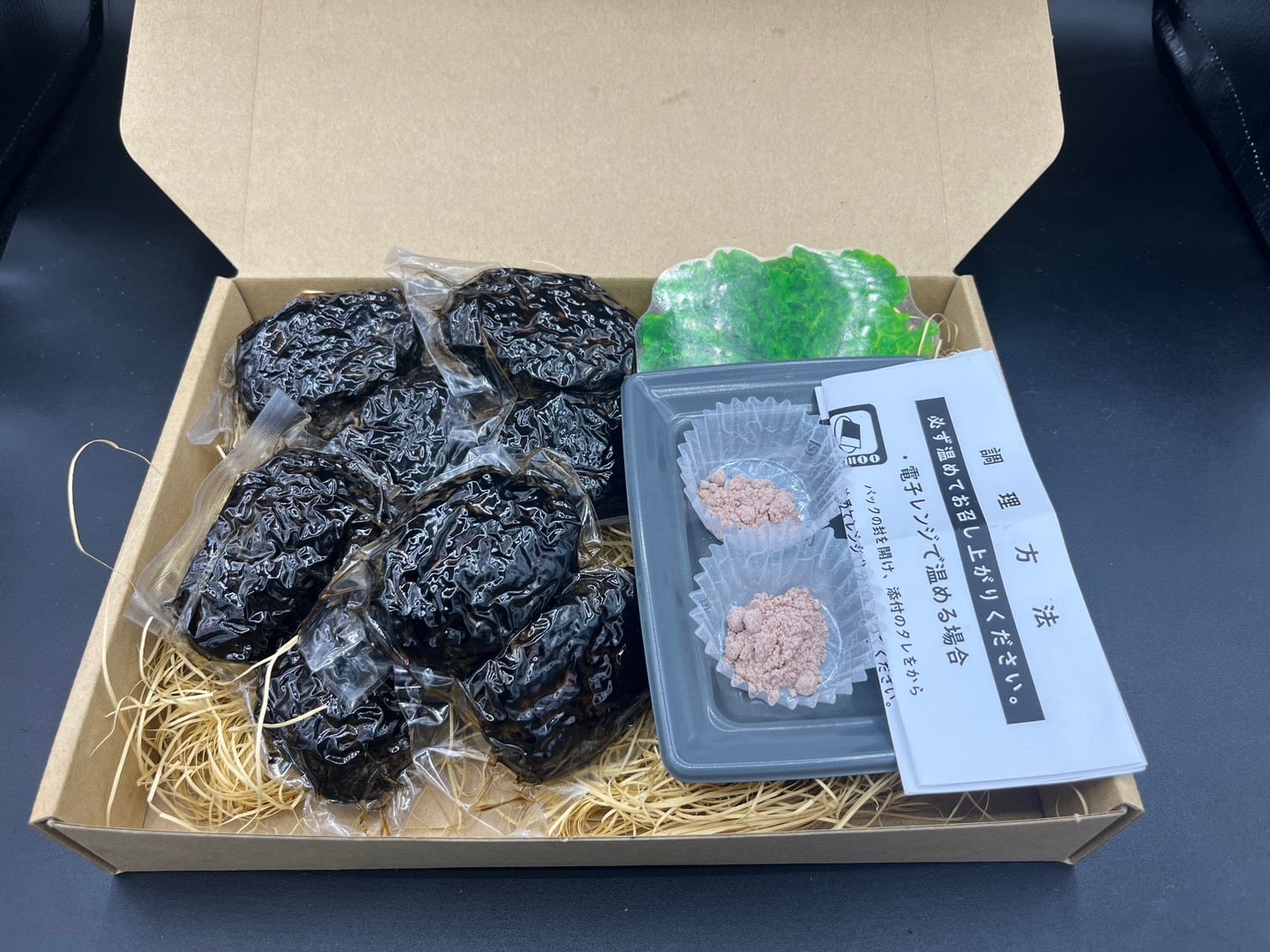 本商品のハンバーグは、じっくりと炭火で焼き上げています。そのため、外はパリっと、中はジューシーな食感を実現しました。黒い見た目も特徴的で、見た目にも楽しめる一品です。炭の香りが食欲をそそり、特別感のある食事を演出します。